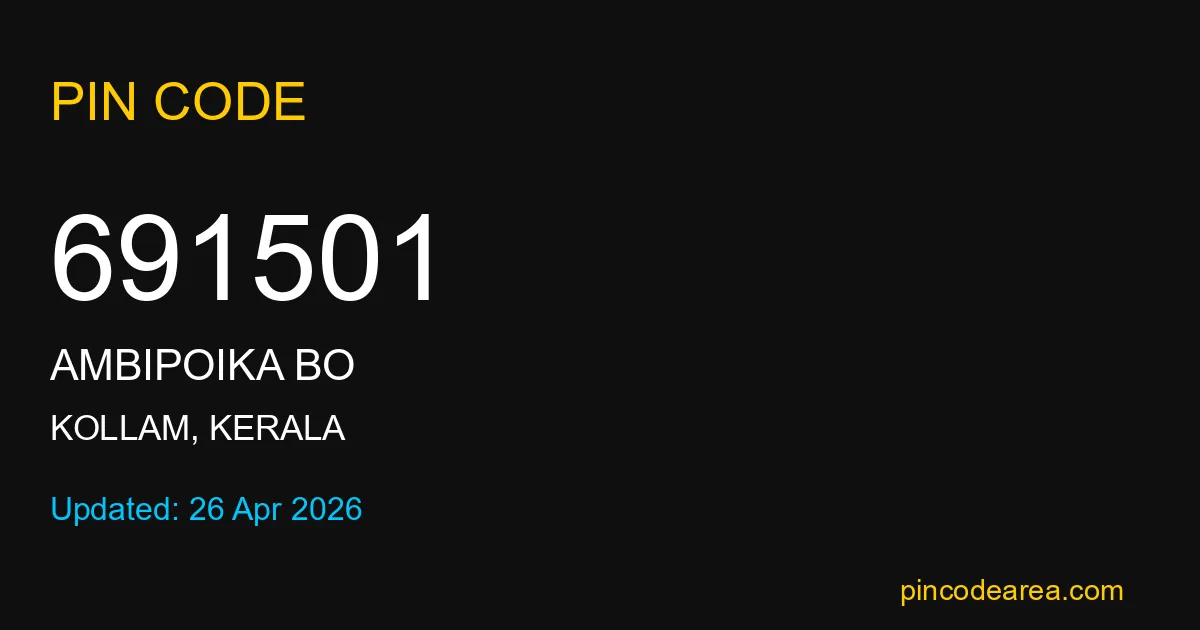 691501 PIN Code is assigned to Ambipoika BO Post Office located in Kollam district of Kerala. It helps identify the exact delivery area for postal and courier services.