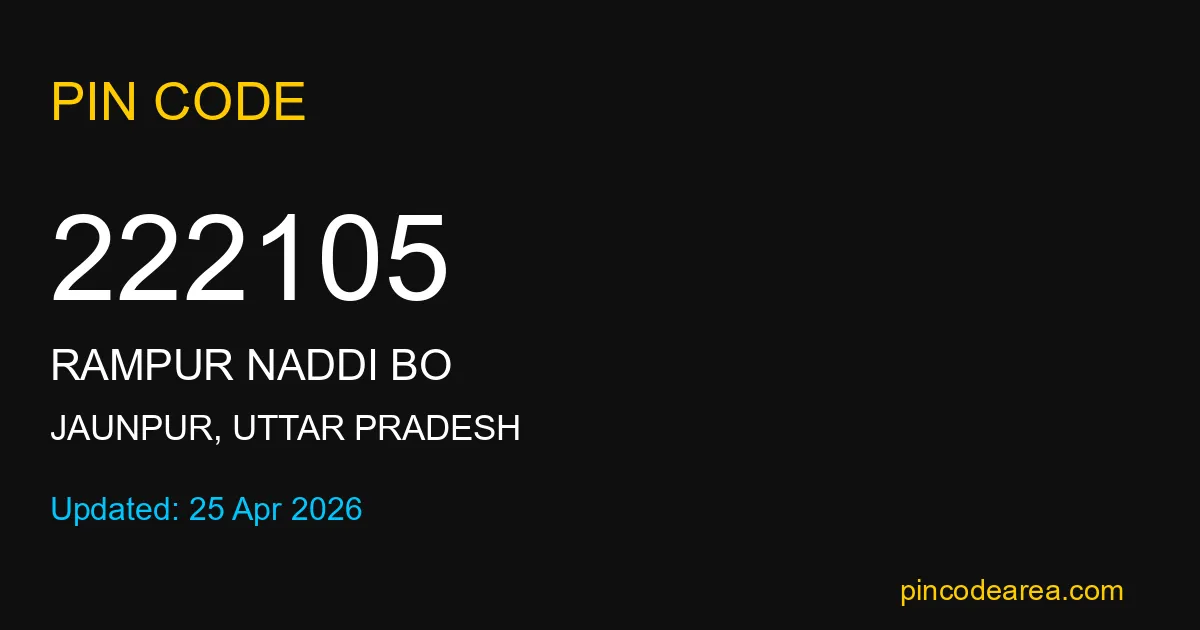 222105 PIN Code belongs to Rampur Naddi BO Post Office in Jaunpur district of Uttar Pradesh, India. This area mainly includes local residential and rural regions where India Post ensures timely mail and parcel delivery services.