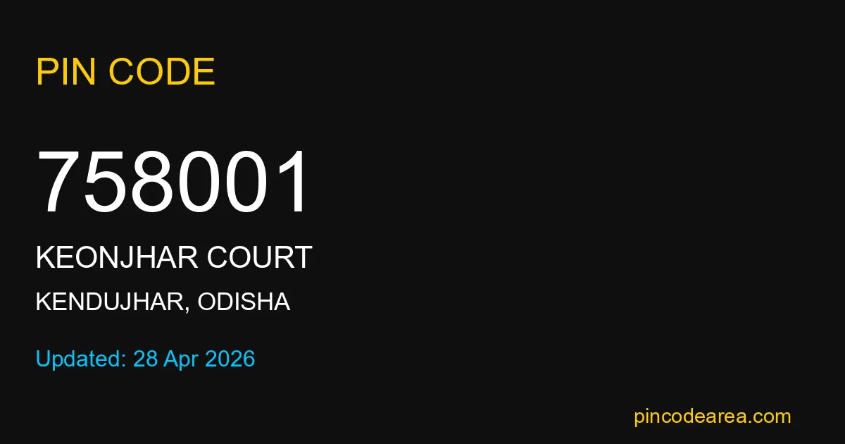 758001 PIN Code is assigned to Keonjhar Court Post Office located in Kendujhar district of Odisha. It helps identify the exact delivery area for postal and courier services.