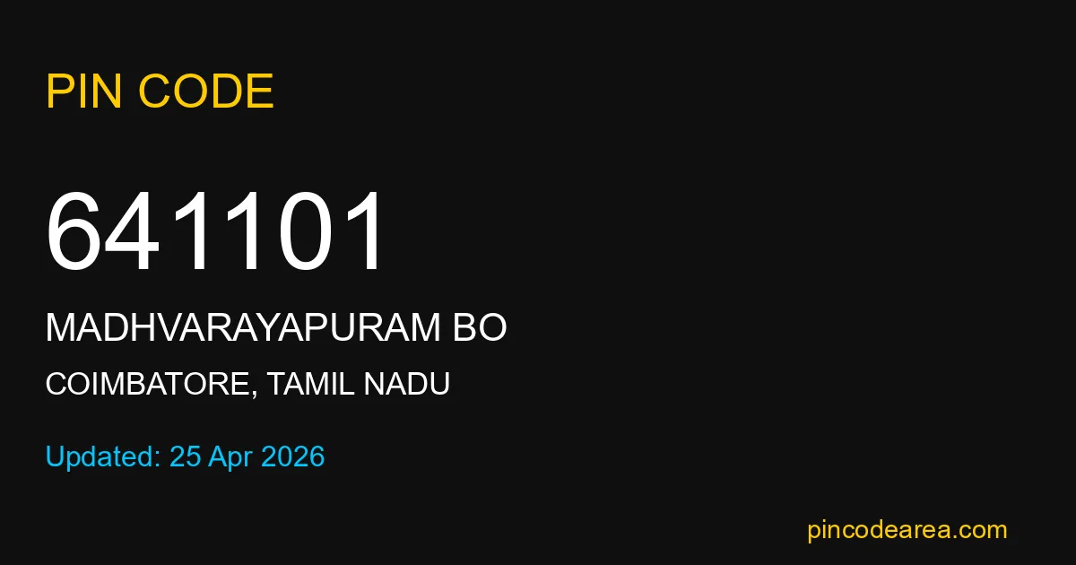 641101 PIN Code belongs to Madhvarayapuram BO Post Office in Coimbatore district of Tamil Nadu, India. This area mainly includes local residential and rural regions where India Post ensures timely mail and parcel delivery services.
