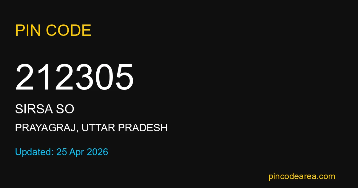 212305 PIN Code is assigned to Sirsa SO Post Office located in Prayagraj district of Uttar Pradesh. It helps in identifying the exact delivery area.