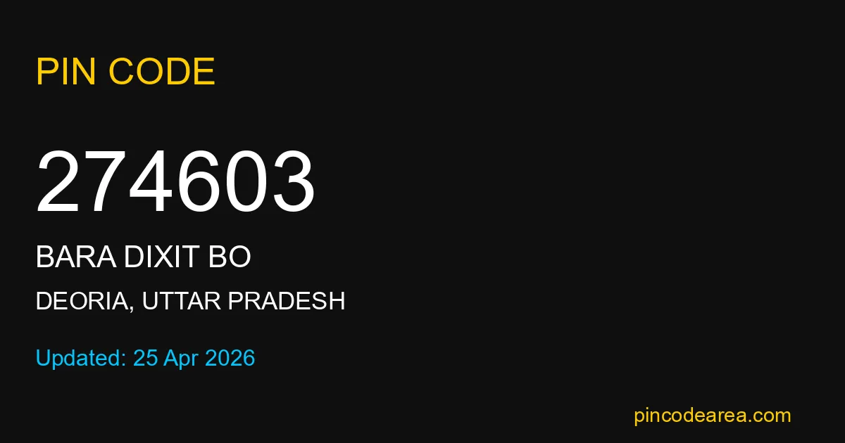 274603 PIN Code is assigned to Bara Dixit BO Post Office located in Deoria district of Uttar Pradesh. It helps in identifying the exact delivery area.