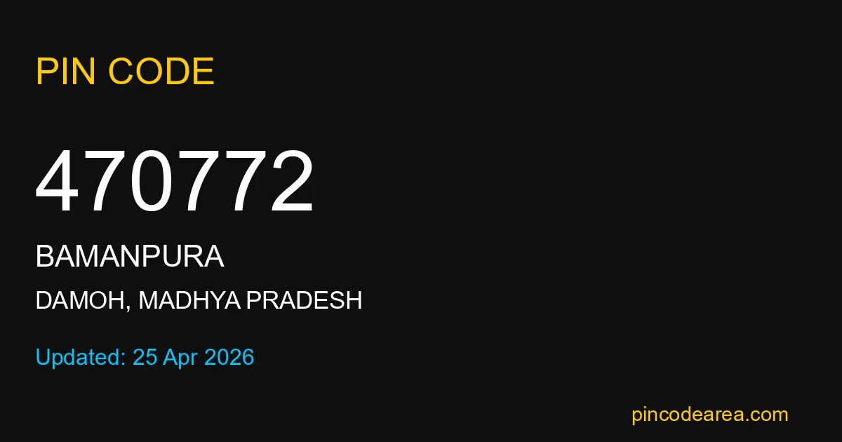 470772 PIN Code is assigned to Bamanpura Post Office located in Damoh district of Madhya Pradesh. It helps in identifying the exact delivery area.