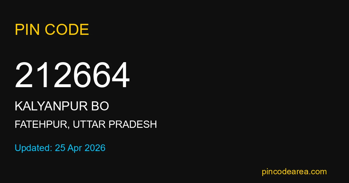 212664 PIN Code belongs to Kalyanpur BO Post Office in Fatehpur district of Uttar Pradesh, India. This area mainly includes local residential and rural regions where India Post ensures timely mail and parcel delivery services.