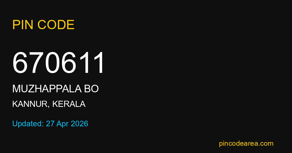 670611 PIN Code is assigned to Muzhappala BO Post Office located in Kannur district of Kerala. It helps identify the exact delivery area for postal and courier services.