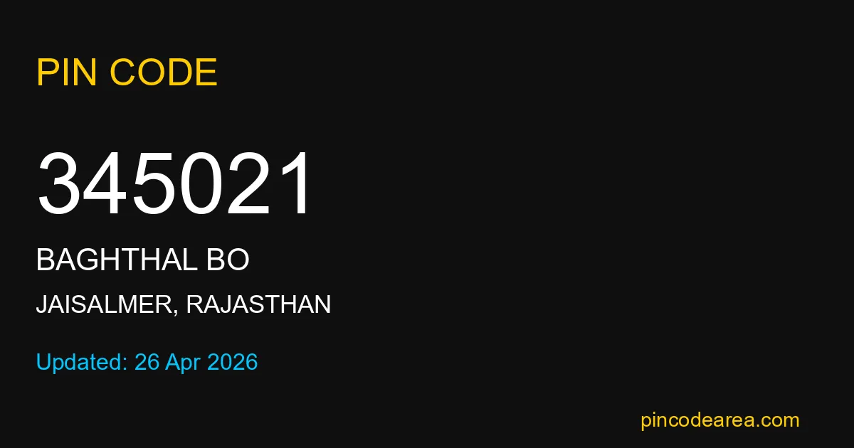 345021 PIN Code is assigned to Baghthal BO Post Office located in Jaisalmer district of Rajasthan. It helps identify the exact delivery area for postal and courier services.