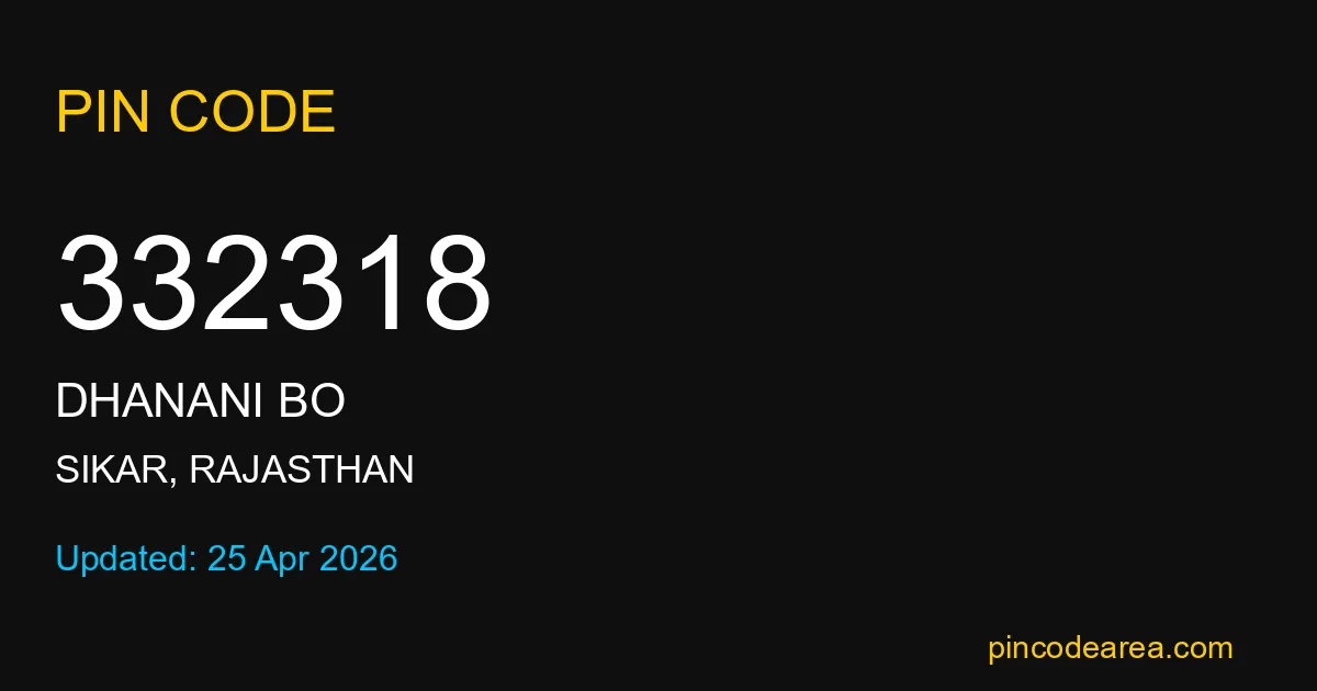332318 PIN Code is assigned to Dhanani BO Post Office located in Sikar district of Rajasthan. It helps in identifying the exact delivery area.