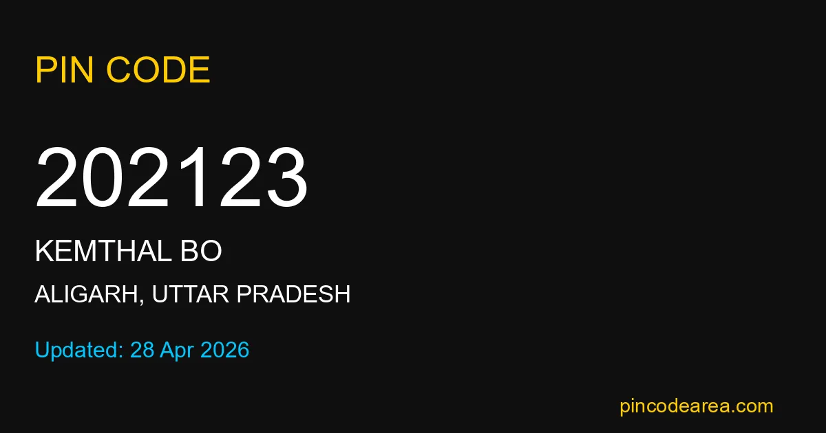 202123 PIN Code is assigned to Kemthal BO Post Office located in Aligarh district of Uttar Pradesh. It helps identify the exact delivery area for postal and courier services.
