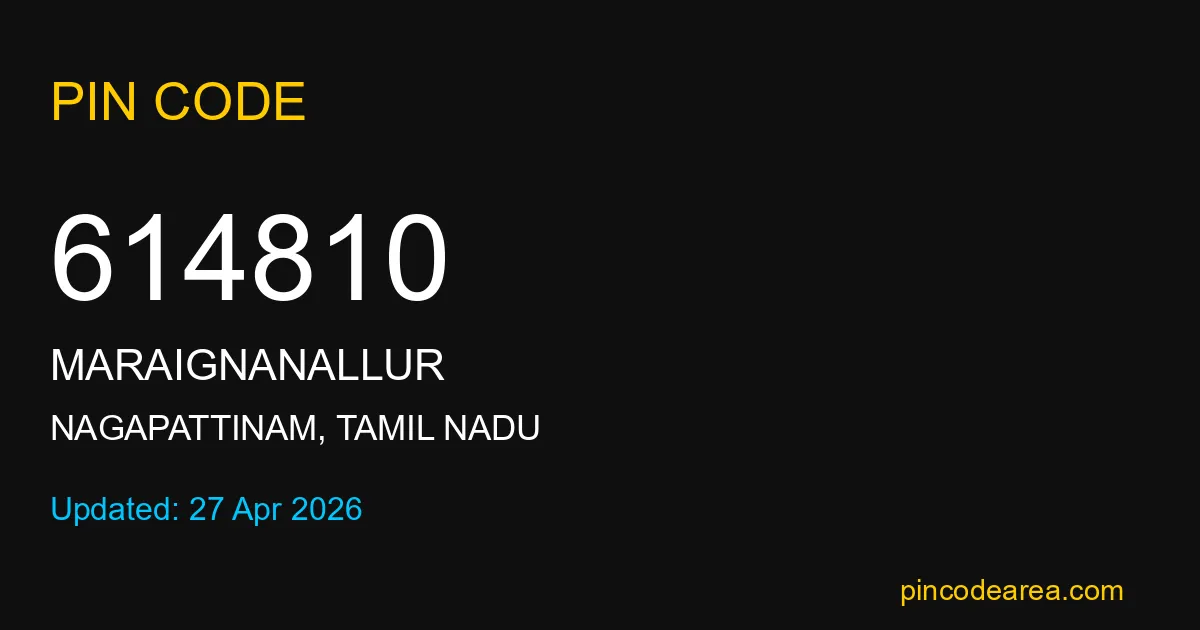 614810 PIN Code is assigned to Maraignanallur Post Office located in Nagapattinam district of Tamil Nadu. It helps identify the exact delivery area for postal and courier services.