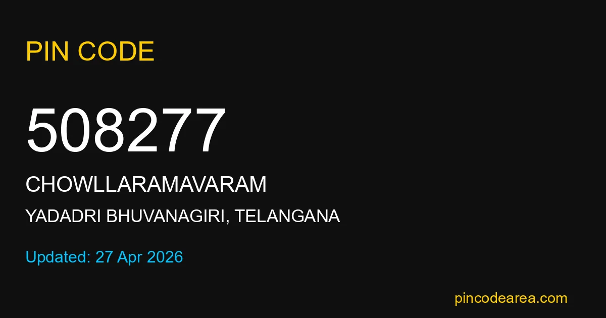 508277 PIN Code is assigned to Chowllaramavaram Post Office located in Yadadri Bhuvanagiri district of Telangana. It helps identify the exact delivery area for postal and courier services.
