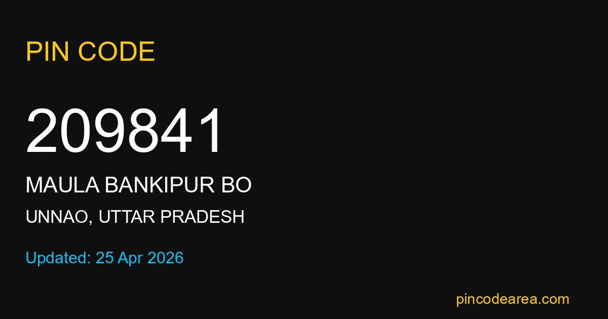 209841 PIN Code is assigned to Maula Bankipur BO Post Office located in Unnao district of Uttar Pradesh. It helps in identifying the exact delivery area.