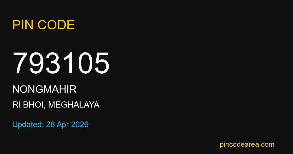 793105 PIN Code is assigned to Nongmahir Post Office located in Ri Bhoi district of Meghalaya. It helps identify the exact delivery area for postal and courier services.