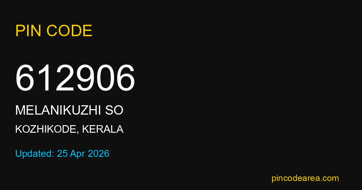 If you are searching for accurate location details, 612906 helps identify the exact postal region of Melanikuzhi SO in Kerala.