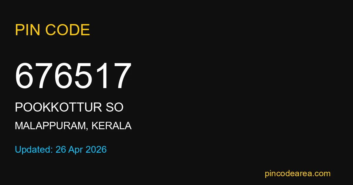 676517 PIN Code is assigned to Pookkottur SO Post Office located in Malappuram district of Kerala. It helps in identifying the exact delivery area.