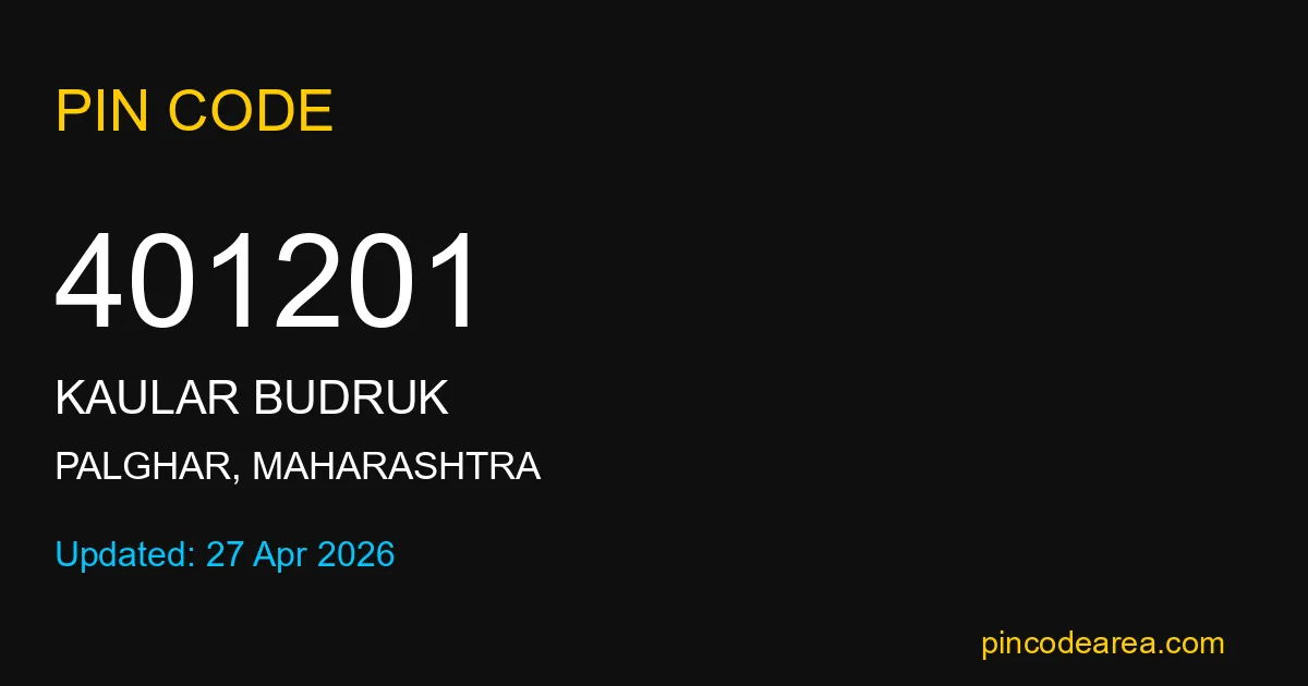 401201 PIN Code belongs to Kaular Budruk Post Office in Palghar district of Maharashtra, India. This area mainly includes local residential and rural regions where India Post ensures timely mail and parcel delivery services.