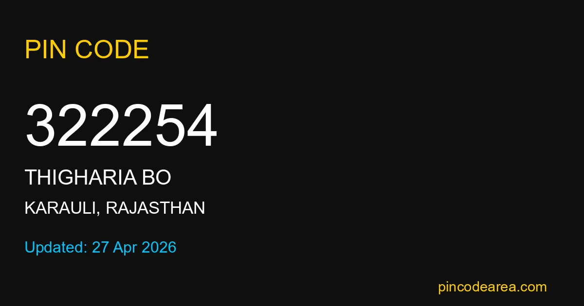 322254 PIN Code belongs to Thigharia BO Post Office in Karauli district of Rajasthan, India. This area mainly includes local residential and rural regions where India Post ensures timely mail and parcel delivery services.