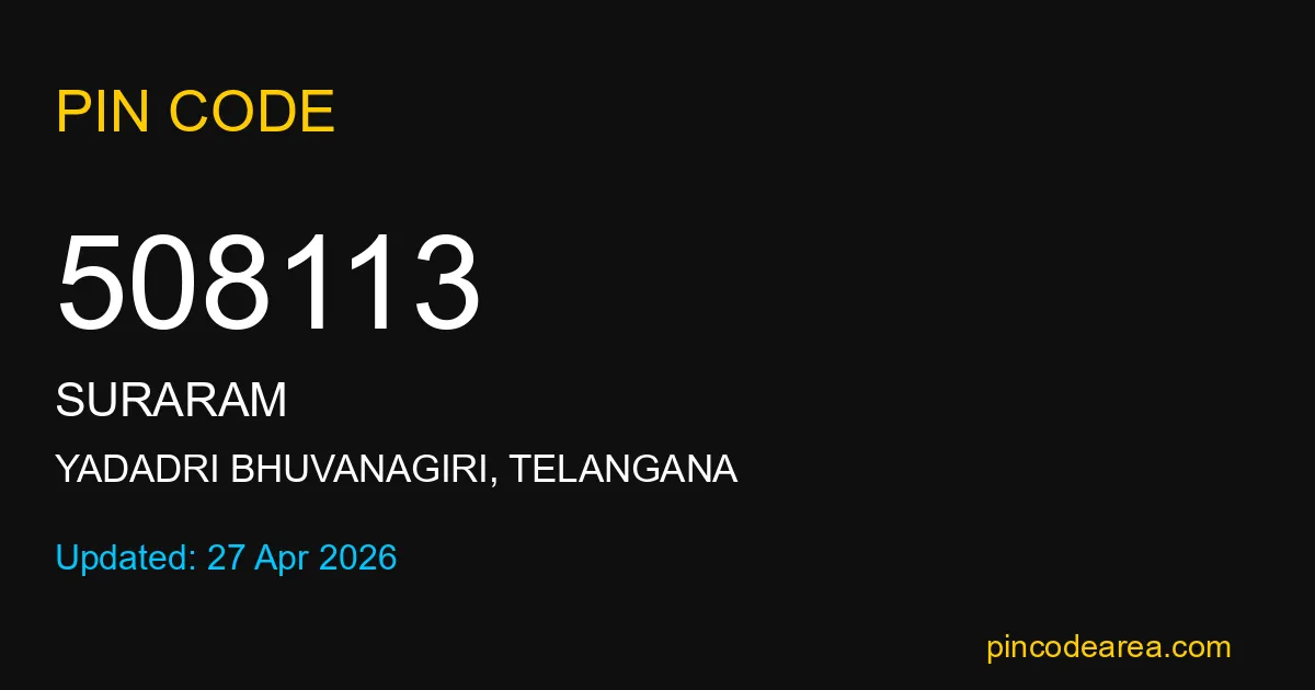 508113 PIN Code is assigned to Suraram Post Office located in Yadadri Bhuvanagiri district of Telangana. It helps identify the exact delivery area for postal and courier services.