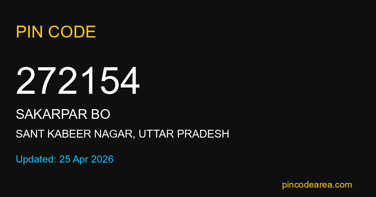 272154 PIN Code belongs to Sakarpar BO Post Office in Sant Kabeer Nagar district of Uttar Pradesh, India. This area mainly includes local residential and rural regions where India Post ensures timely mail and parcel delivery services.