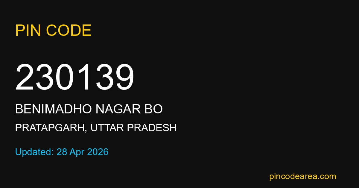 230139 PIN Code is assigned to Benimadho Nagar BO Post Office located in Pratapgarh district of Uttar Pradesh. It helps identify the exact delivery area for postal and courier services.
