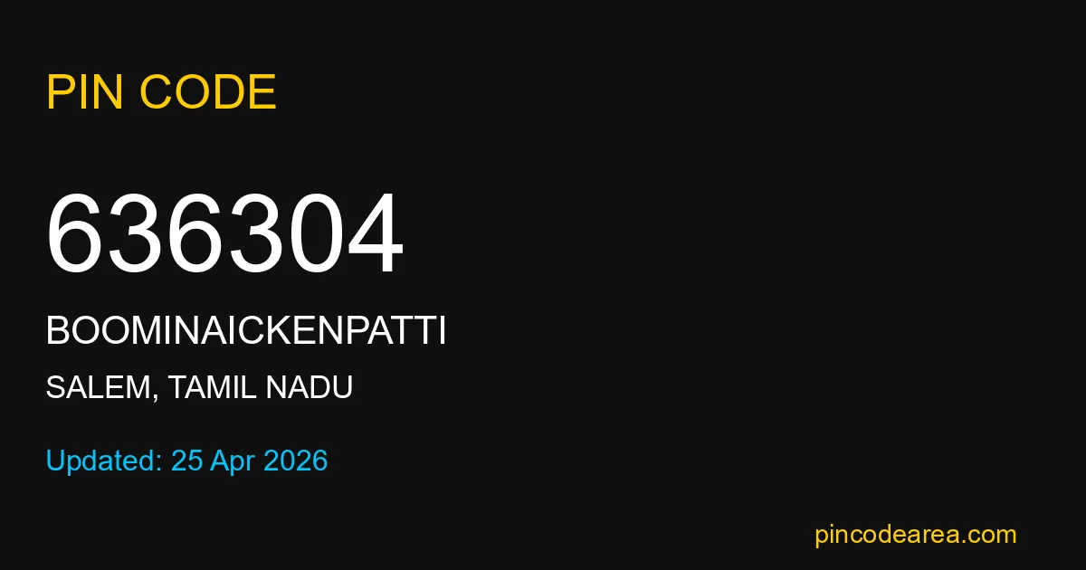 636304 PIN Code is assigned to Boominaickenpatti Post Office located in Salem district of Tamil Nadu. It helps in identifying the exact delivery area.