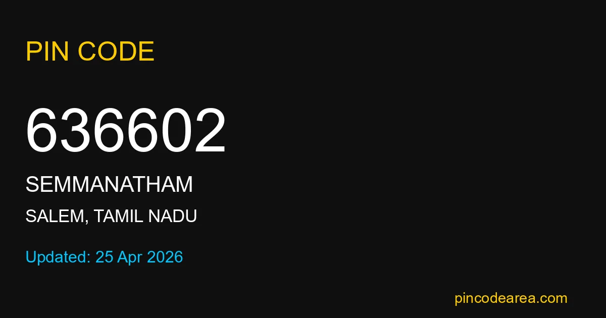 636602 PIN Code is assigned to Semmanatham Post Office located in Salem district of Tamil Nadu. It helps in identifying the exact delivery area.