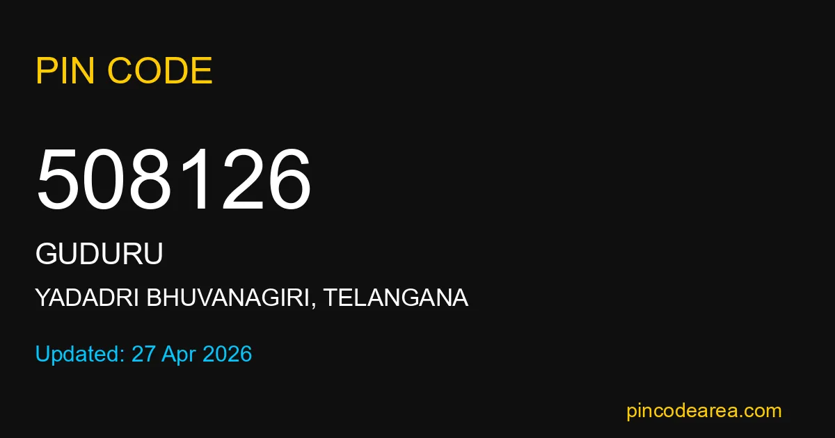 508126 PIN Code is assigned to Guduru Post Office located in Yadadri Bhuvanagiri district of Telangana. It helps identify the exact delivery area for postal and courier services.