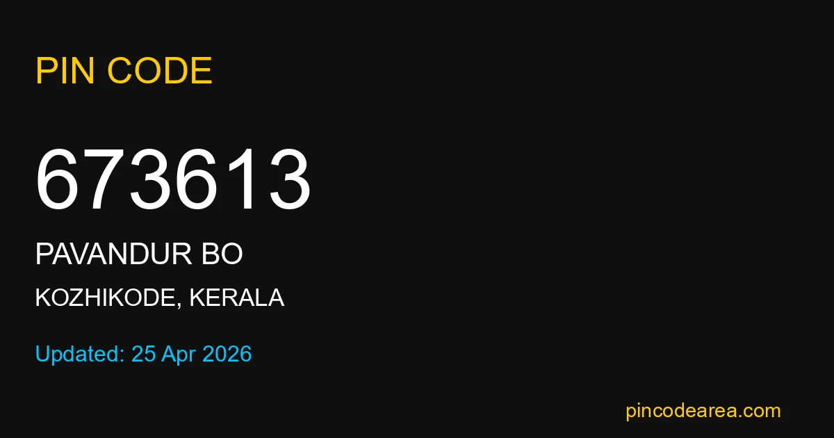 673613 PIN Code is assigned to Pavandur BO Post Office located in Kozhikode district of Kerala. It helps in identifying the exact delivery area.