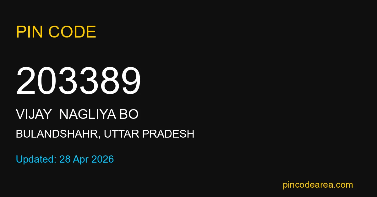 203389 PIN Code is assigned to Vijay Nagliya BO Post Office located in Bulandshahr district of Uttar Pradesh. It helps identify the exact delivery area for postal and courier services.