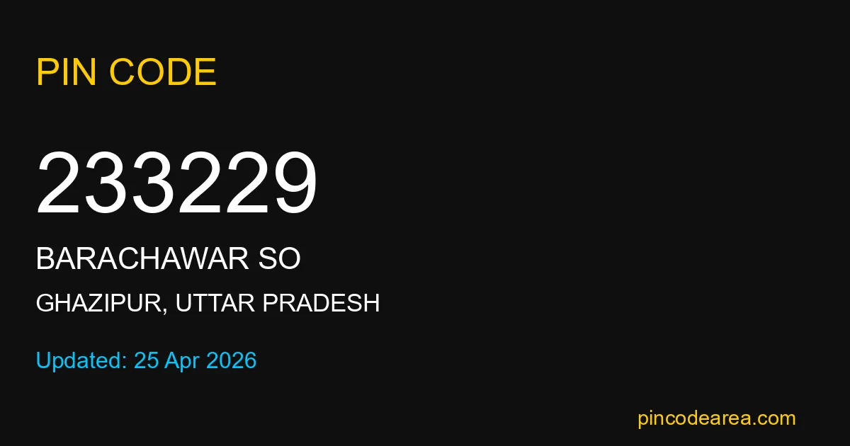 233229 PIN Code is assigned to BARACHAWAR SO Post Office located in Ghazipur district of Uttar Pradesh. It helps in identifying the exact delivery area.