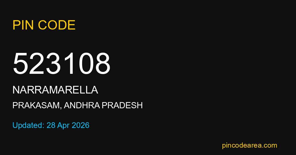 523108 PIN Code is assigned to Narramarella Post Office located in Prakasam district of Andhra Pradesh. It helps identify the exact delivery area for postal and courier services.