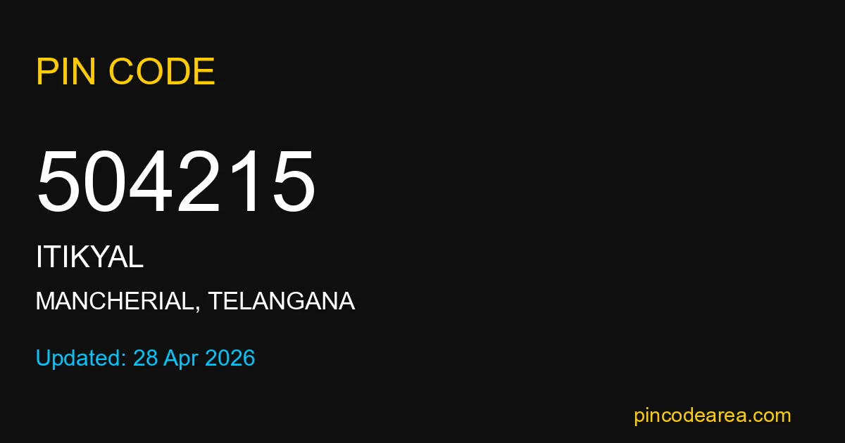 504215 PIN Code is assigned to Itikyal Post Office located in Mancherial district of Telangana. It helps identify the exact delivery area for postal and courier services.