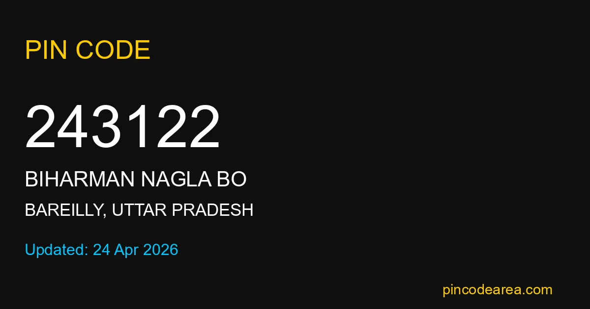 243122 PIN Code belongs to Biharman Nagla BO Post Office in Bareilly district of Uttar Pradesh, India. This area mainly includes local residential and rural regions where India Post ensures timely mail and parcel delivery services.