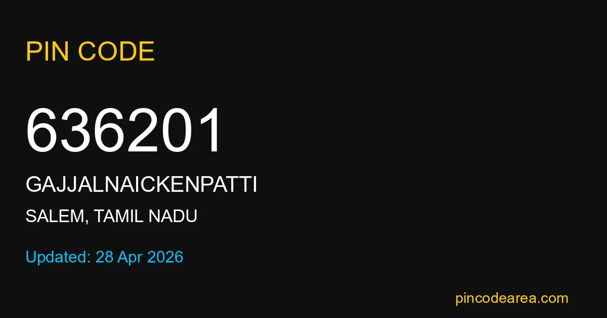 636201 PIN Code is assigned to Gajjalnaickenpatti Post Office located in Salem district of Tamil Nadu. It helps identify the exact delivery area for postal and courier services.