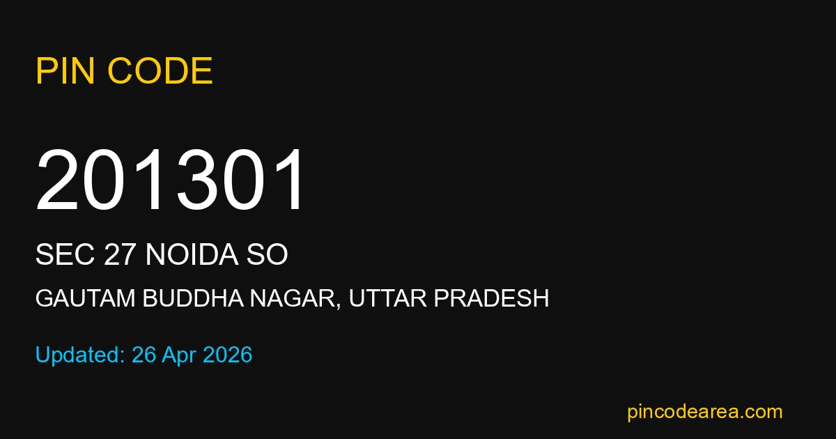 201301 PIN Code is assigned to Sec 27 Noida SO Post Office located in Gautam Buddha Nagar district of Uttar Pradesh. It helps identify the exact delivery area for postal and courier services.