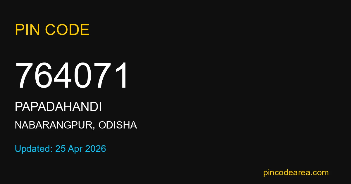 764071 PIN Code is assigned to Papadahandi Post Office located in Nabarangpur district of Odisha. It helps in identifying the exact delivery area.