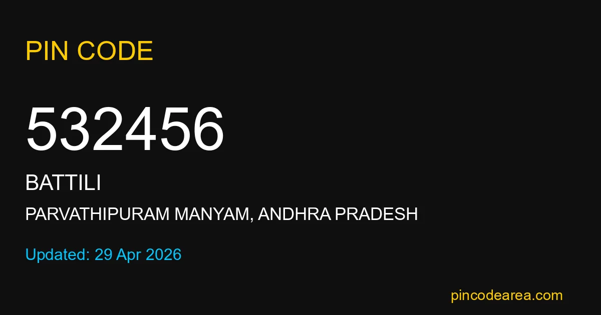 If you are searching for accurate location details, 532456 helps identify the exact postal region of Battili in Andhra Pradesh.
