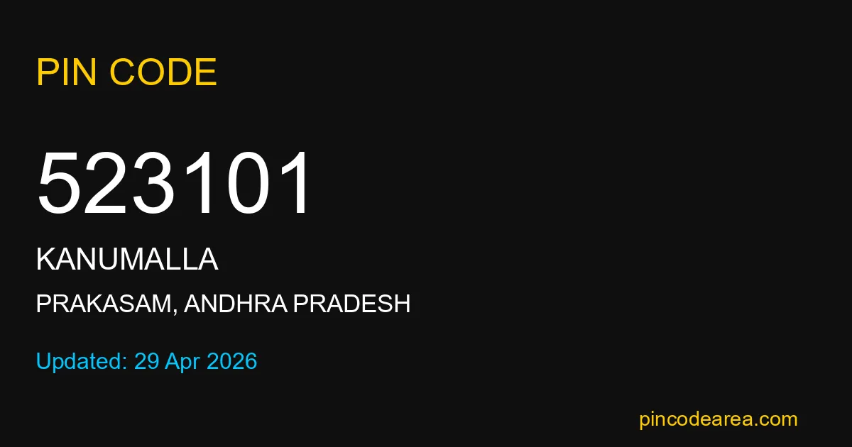 523101 PIN Code is assigned to Kanumalla Post Office located in Prakasam district of Andhra Pradesh. It helps identify the exact delivery area for postal and courier services.