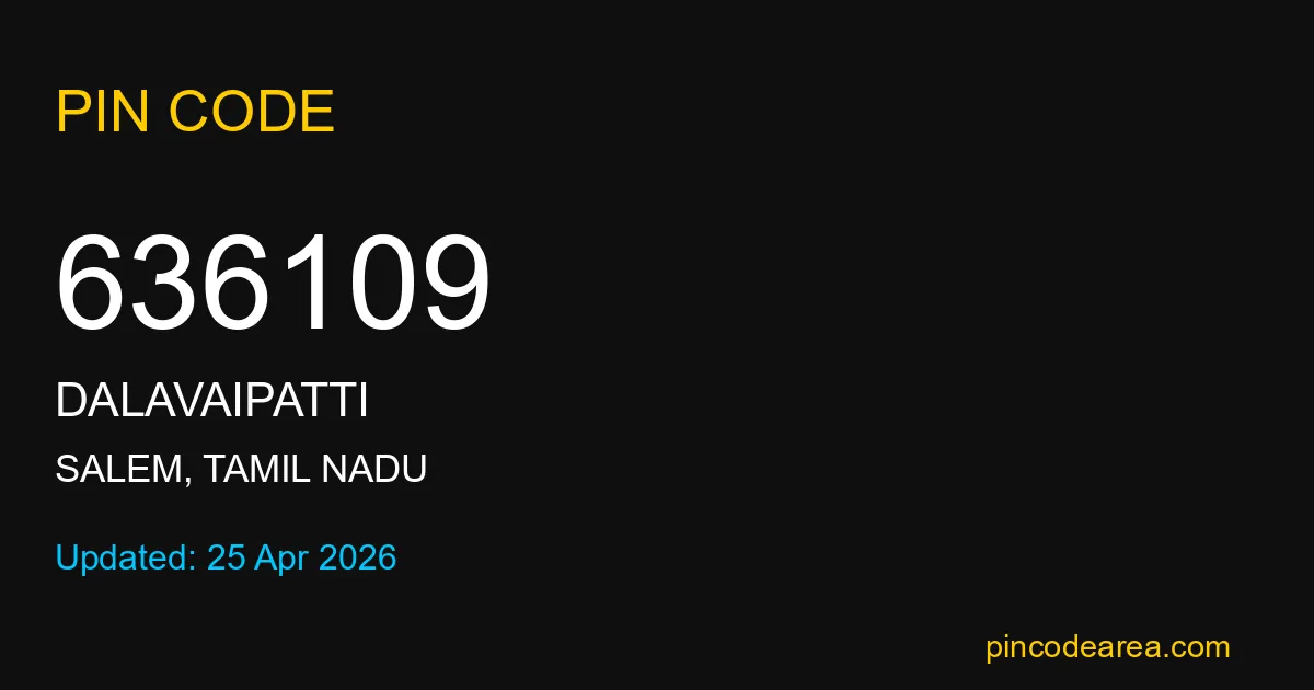 636109 PIN Code is assigned to Dalavaipatti Post Office located in Salem district of Tamil Nadu. It helps in identifying the exact delivery area.