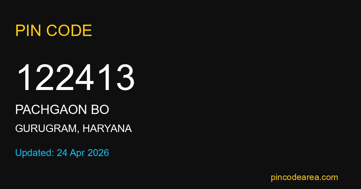 122413 PIN Code is assigned to Pachgaon BO Post Office located in Gurugram district of Haryana. It helps in identifying the exact delivery area.