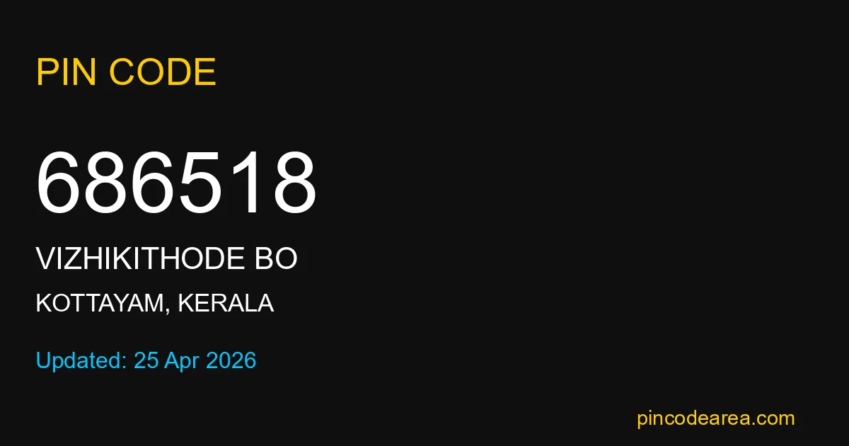 686518 PIN Code belongs to Vizhikithode BO Post Office in Kottayam district of Kerala, India. This area mainly includes local residential and rural regions where India Post ensures timely mail and parcel delivery services.