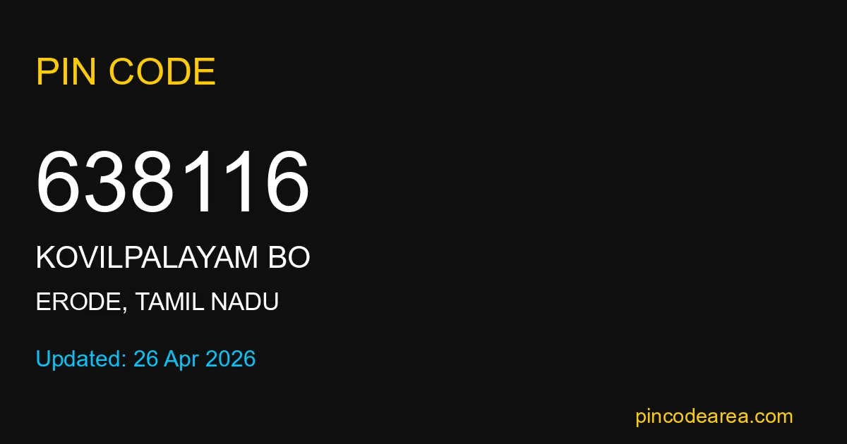 If you are searching for accurate location details, 638116 helps identify the exact postal region of Kovilpalayam BO in Tamil Nadu.
