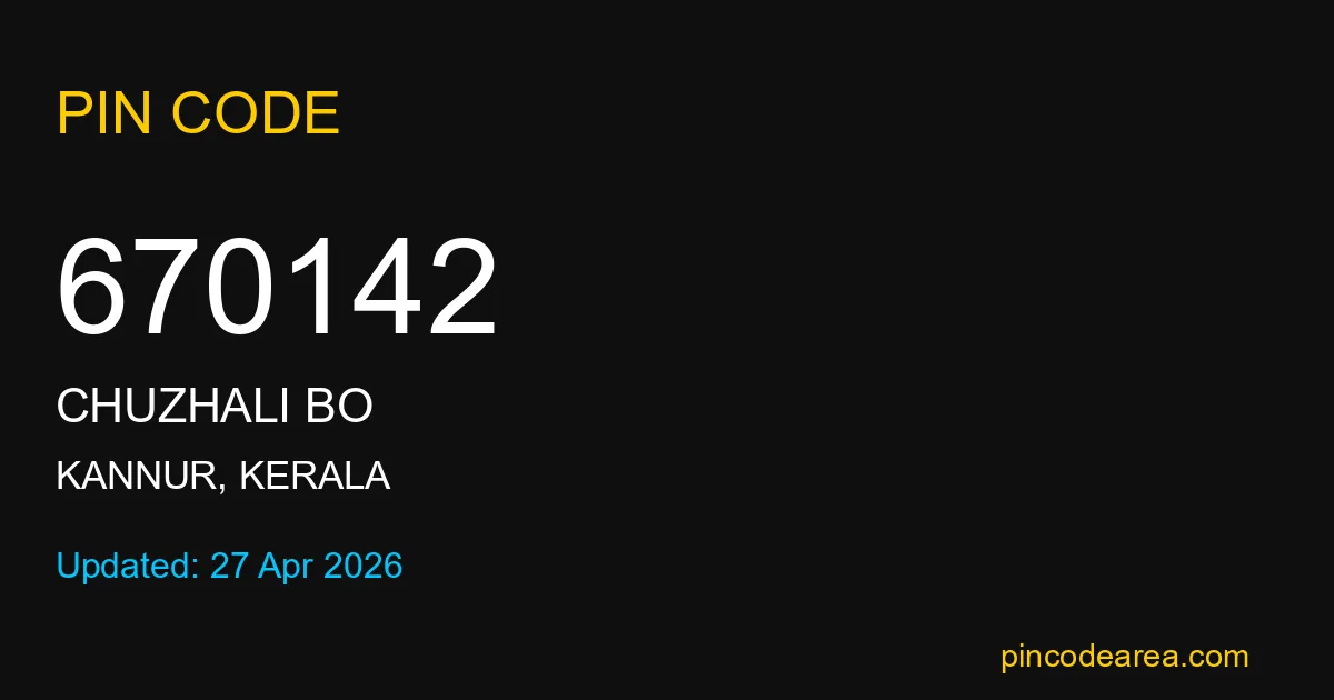 670142 PIN Code is assigned to Chuzhali BO Post Office located in Kannur district of Kerala. It helps identify the exact delivery area for postal and courier services.