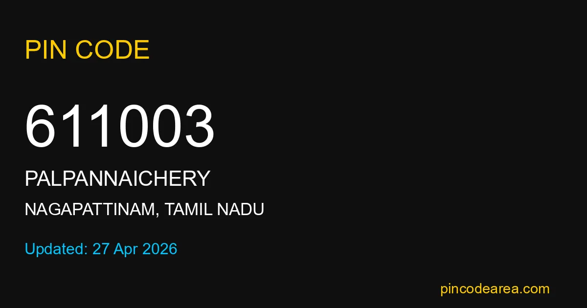611003 PIN Code is assigned to Palpannaichery Post Office located in Nagapattinam district of Tamil Nadu. It helps in identifying the exact delivery area.