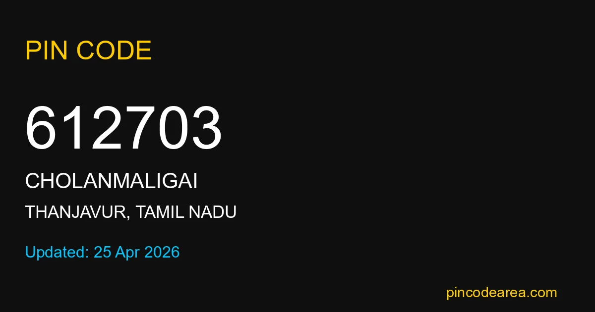 612703 PIN Code is assigned to Cholanmaligai Post Office located in Thanjavur district of Tamil Nadu. It helps in identifying the exact delivery area.