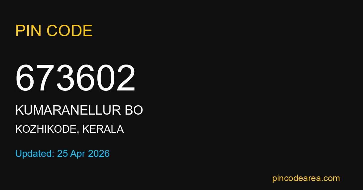 673602 PIN Code is assigned to Kumaranellur BO Post Office located in Kozhikode district of Kerala. It helps in identifying the exact delivery area.