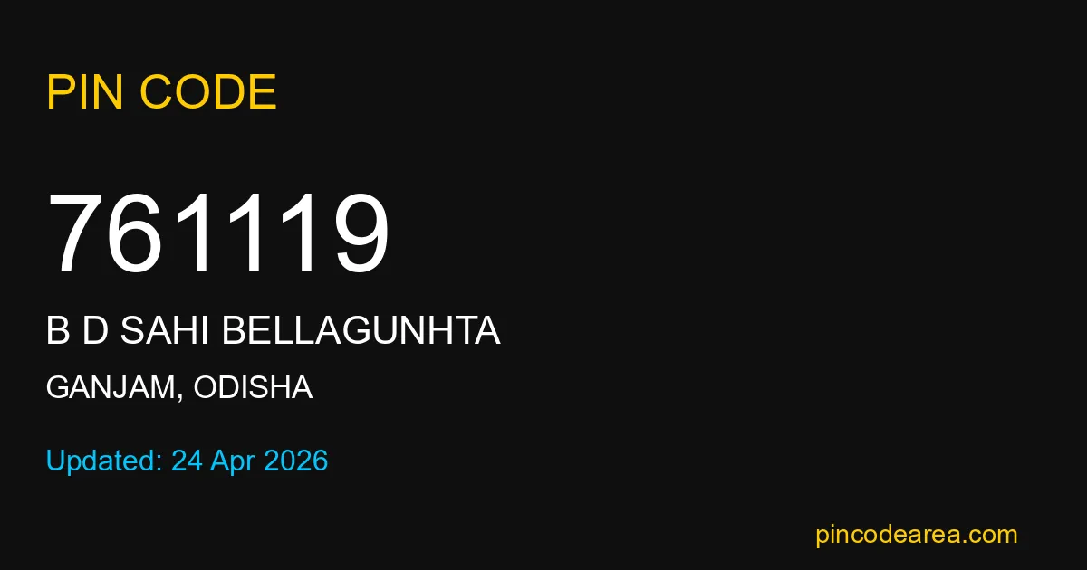 761119 PIN Code is assigned to B D Sahi Bellagunhta Post Office located in Ganjam district of Odisha. It helps in identifying the exact delivery area.