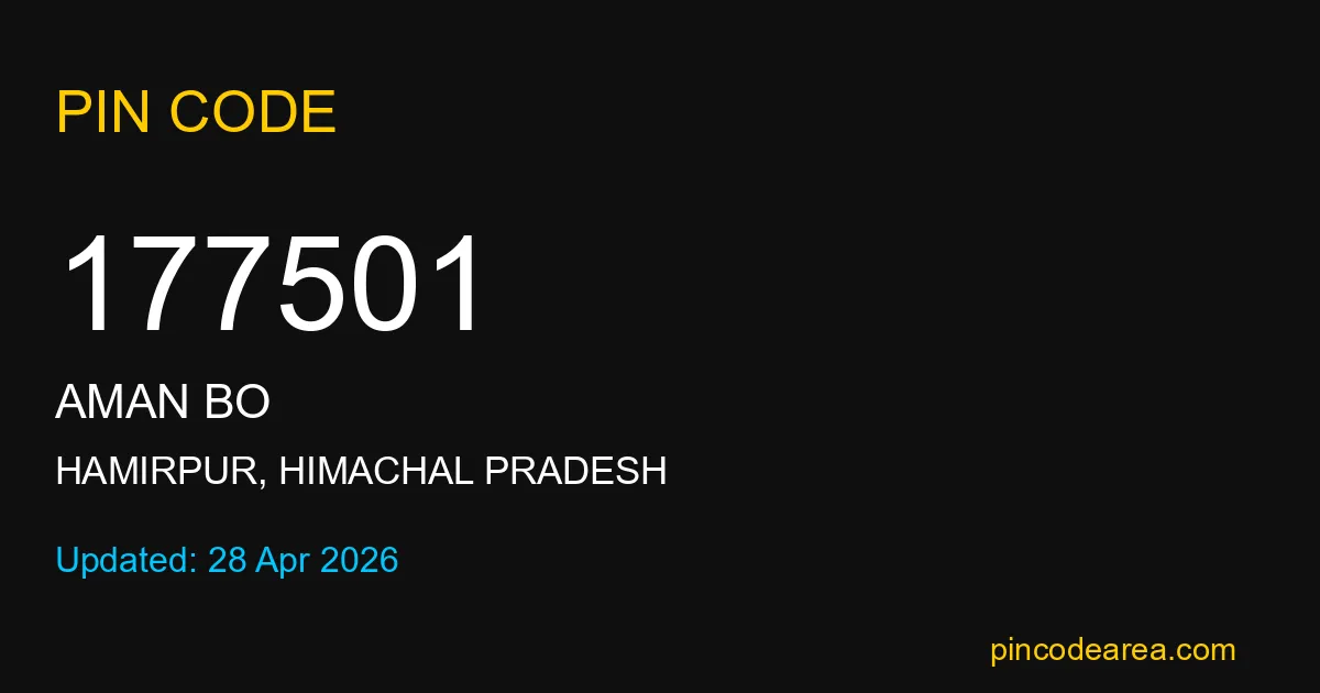 177501 PIN Code is assigned to Aman BO Post Office located in Hamirpur district of Himachal Pradesh. It helps identify the exact delivery area for postal and courier services.