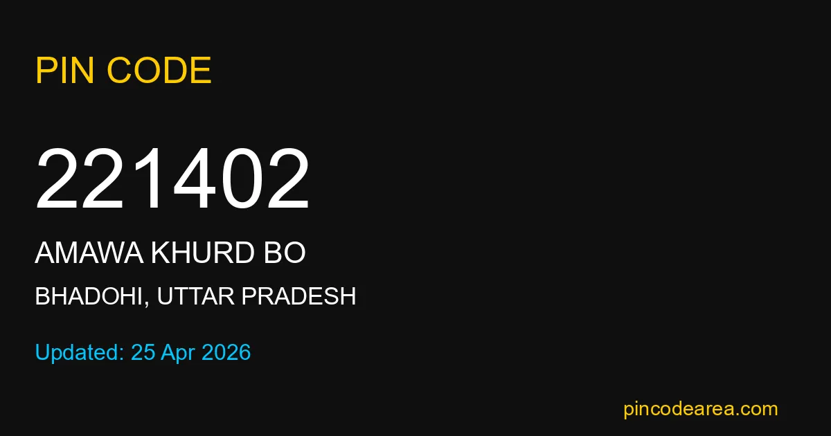 221402 PIN Code belongs to Amawa Khurd BO Post Office in Bhadohi district of Uttar Pradesh, India. This area mainly includes local residential and rural regions where India Post ensures timely mail and parcel delivery services.