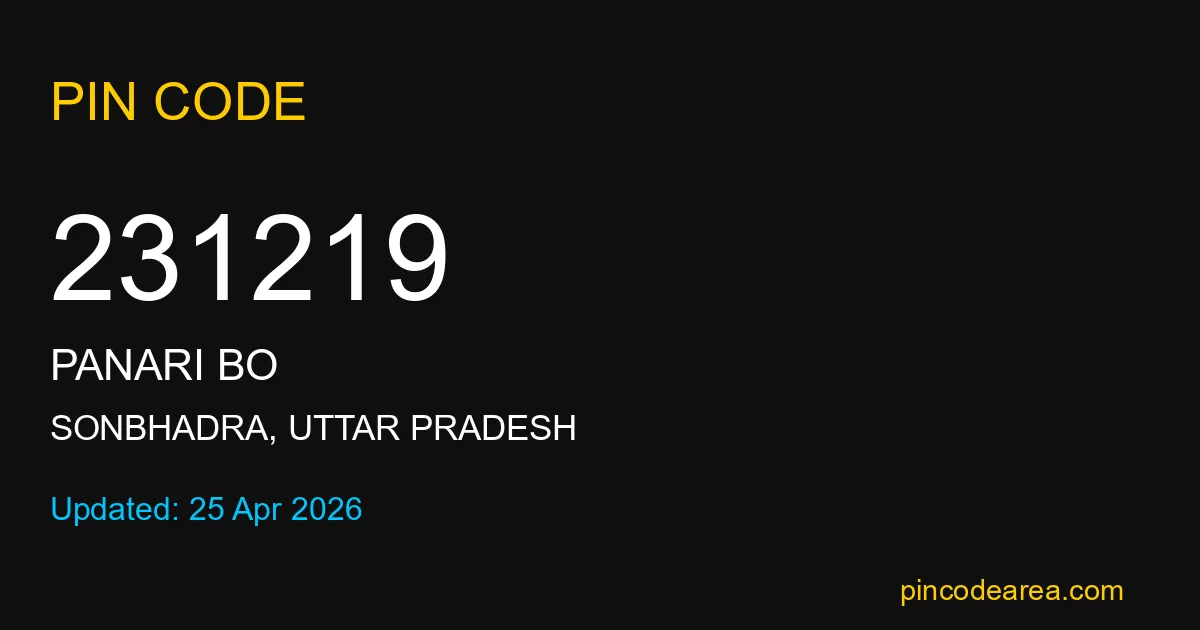 231219 PIN Code belongs to Panari BO Post Office in Sonbhadra district of Uttar Pradesh, India. This area mainly includes local residential and rural regions where India Post ensures timely mail and parcel delivery services.