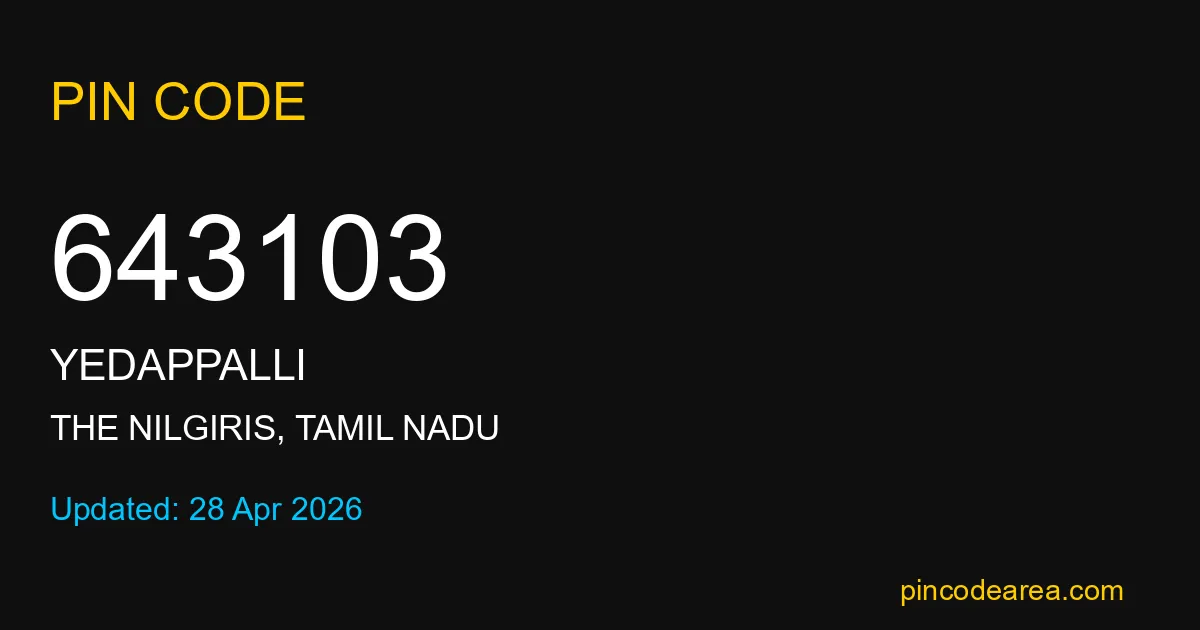 643103 PIN Code belongs to Yedappalli Post Office in The Nilgiris district of Tamil Nadu, India. This area mainly includes local residential and rural regions where India Post ensures timely mail and parcel delivery services.